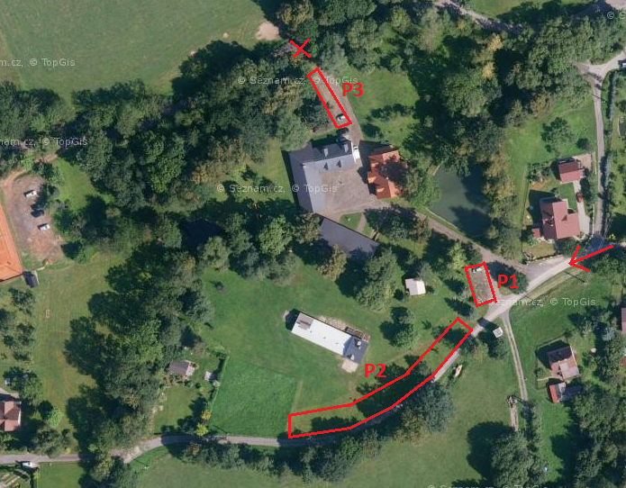 Zaparkujte prosím na parkovištích 1 nebo 2. Brána k parkovišti 3 bude uzavřena, je tedy potřeba přijet z "horní" strany, přímo k P1 a P2.